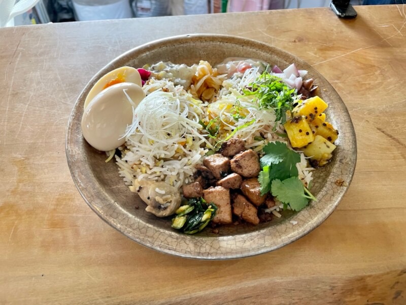 I ordered a combination of firefly squid biryani and sea bream soup biryani, topped with a spiced egg and yam achar!